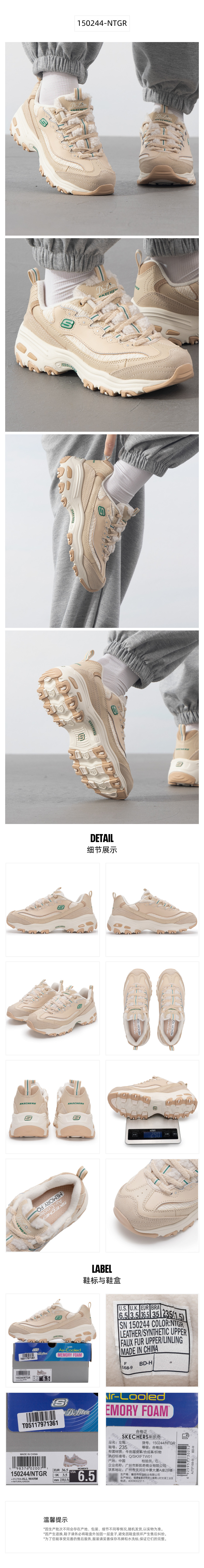 斯凯奇(Skechers) 女运动休闲鞋熊猫鞋 150244-NTGR 35 35 自然色/绿色(单位:双)