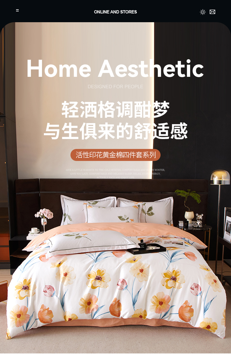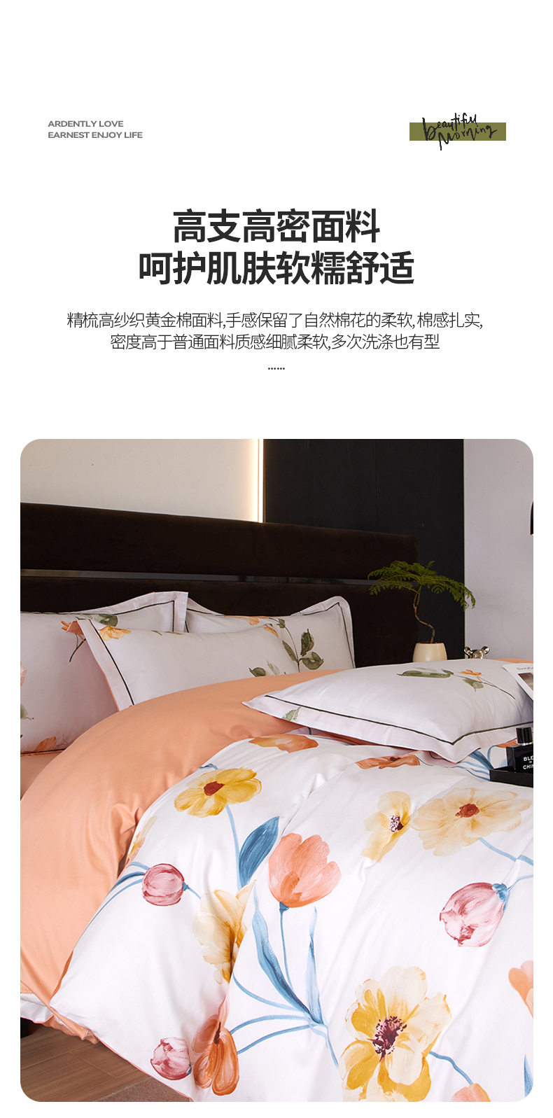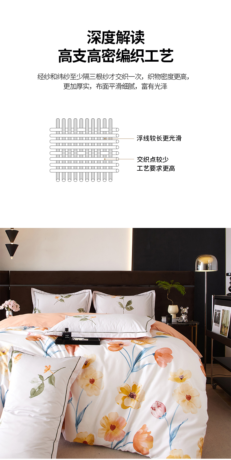 棉中贵族,高支高密铂金全棉面料,细腻棉柔,光泽自然, AB版活性印花,经过绿色工艺精细织造,四季可用,优雅之上,健康舒适睡眠。