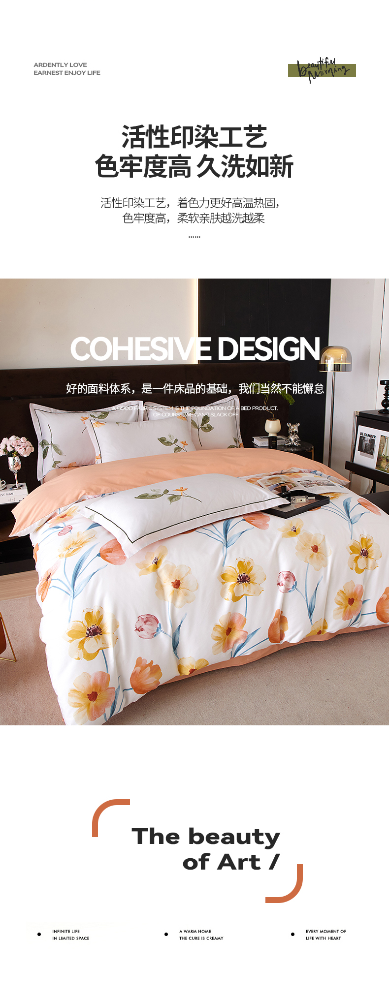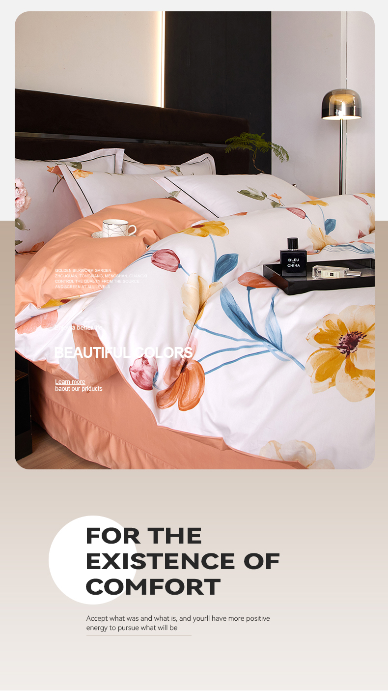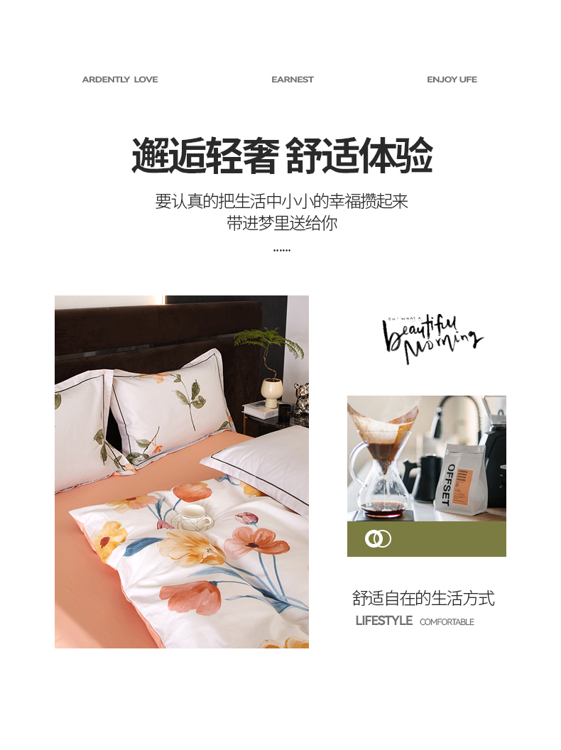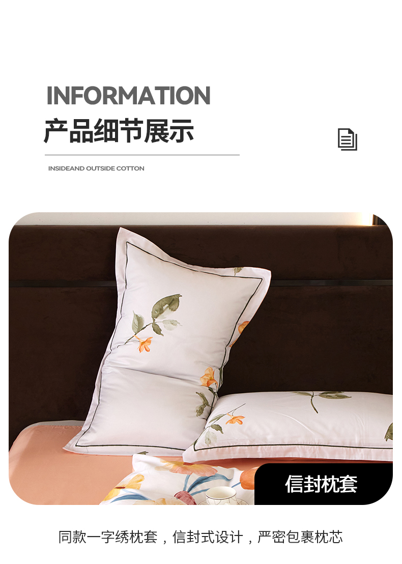 棉中贵族,高支高密铂金全棉面料,细腻棉柔,光泽自然, AB版活性印花,经过绿色工艺精细织造,四季可用,优雅之上,健康舒适睡眠。