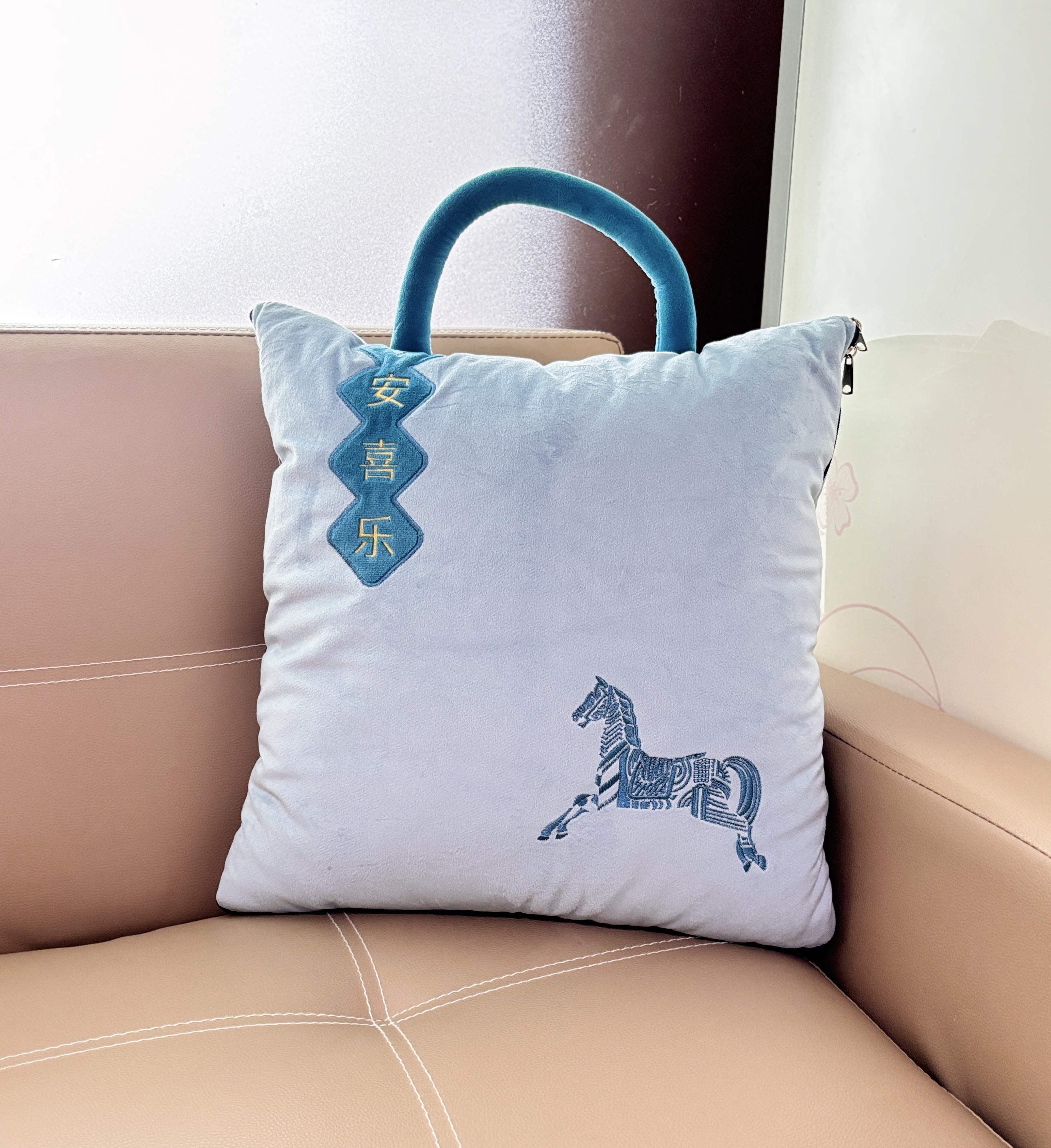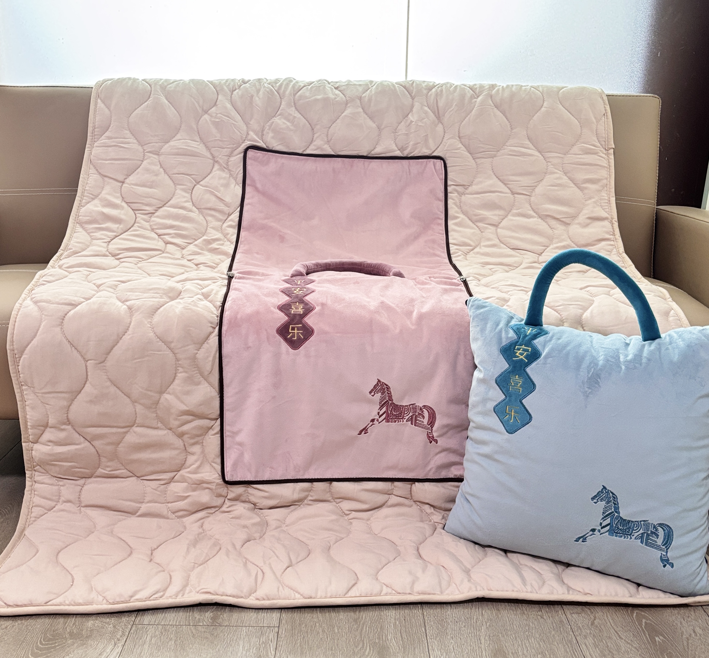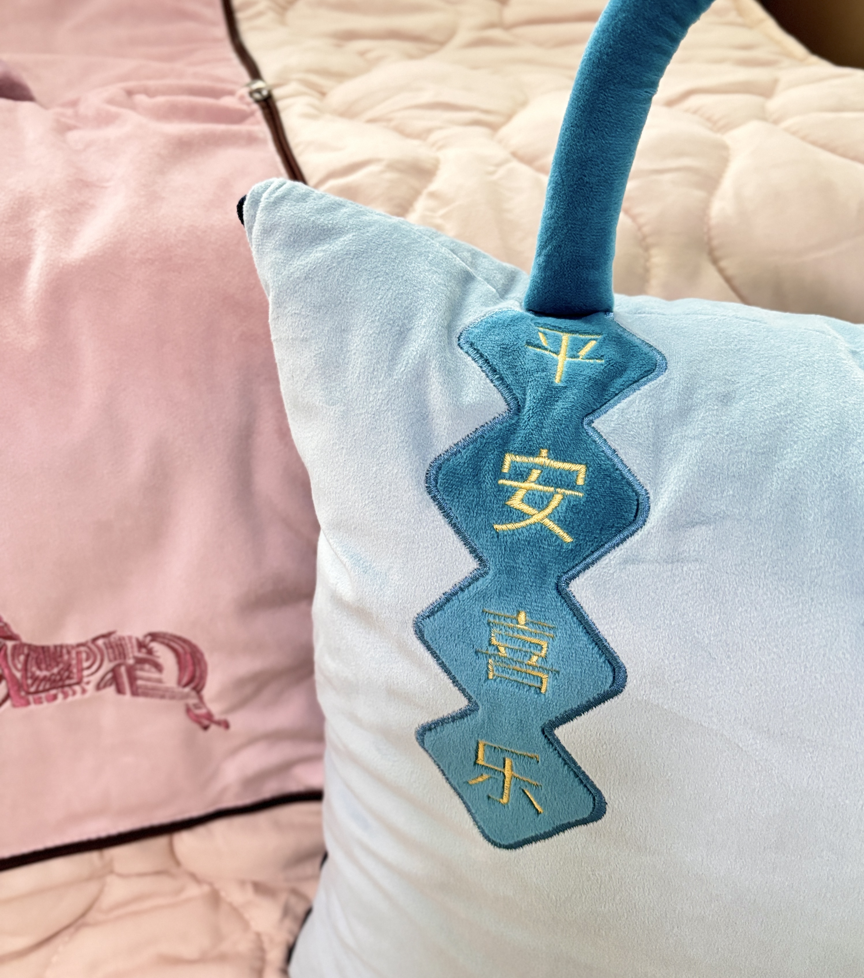 升级手提设计,高阶品质,使用和携带更方便,牛奶般温润,透气轻盈,柔软相伴。抱枕被被壳选用超柔荷兰绒面料,被芯水洗棉面料,柔软亲肤,吸湿透气性极佳,高精密刺绣,平安喜乐寓意满满,福气环绕。展开是被子,抱枕、趴枕、旅行被、靠垫、空调被,满足日常多个场所,点缀缤纷生活。