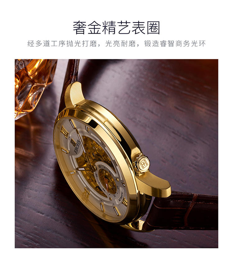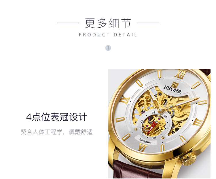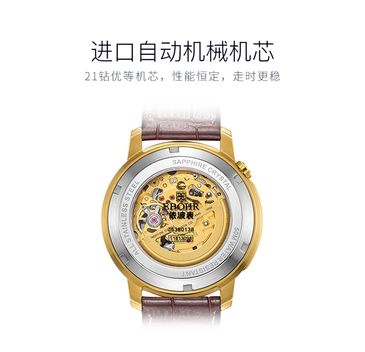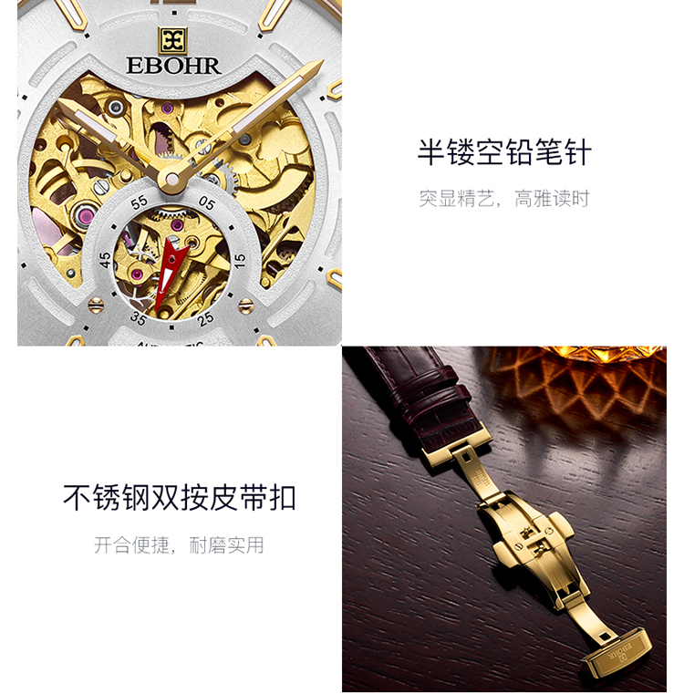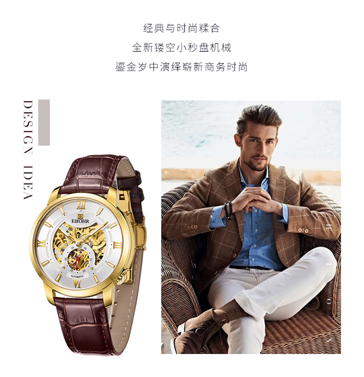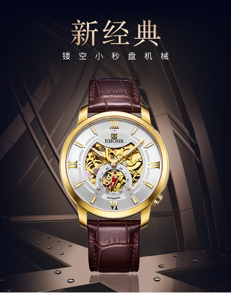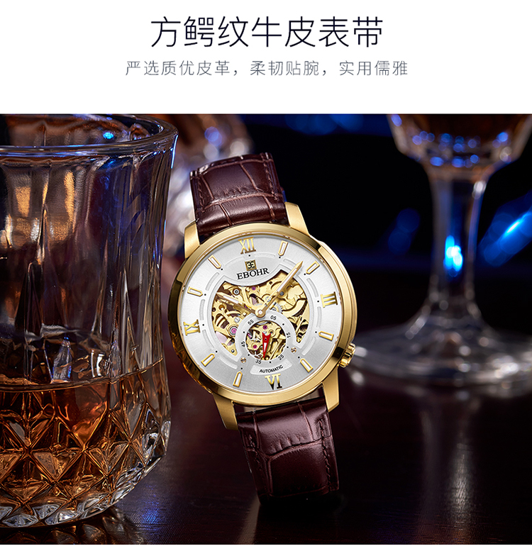 依波(EBOHR)经典时尚全镂空小秒盘自动机械皮带防水商务男表 36380138 金壳白面棕色皮带