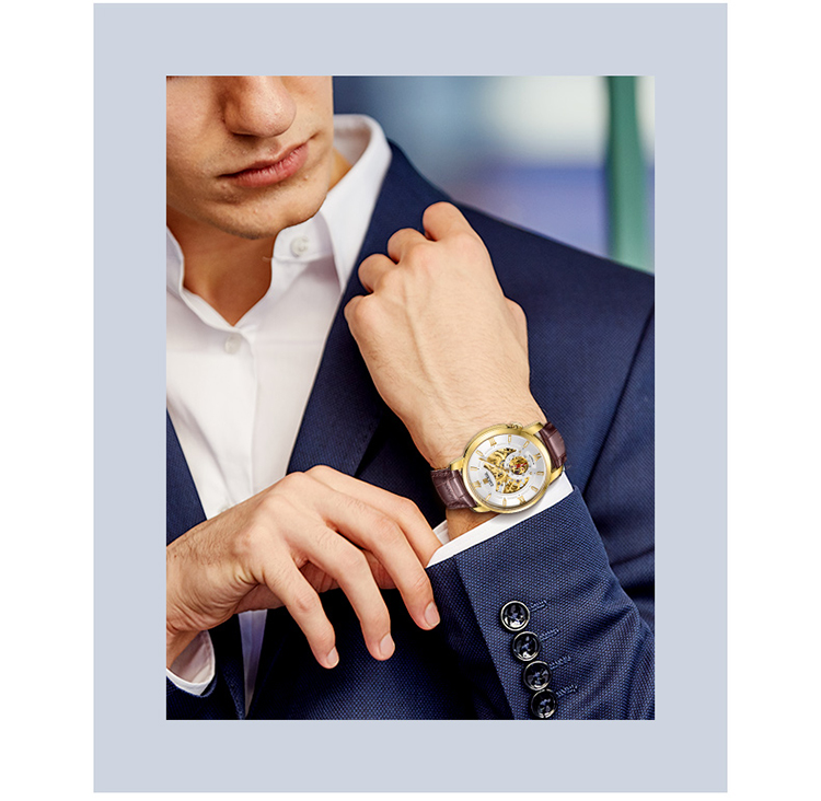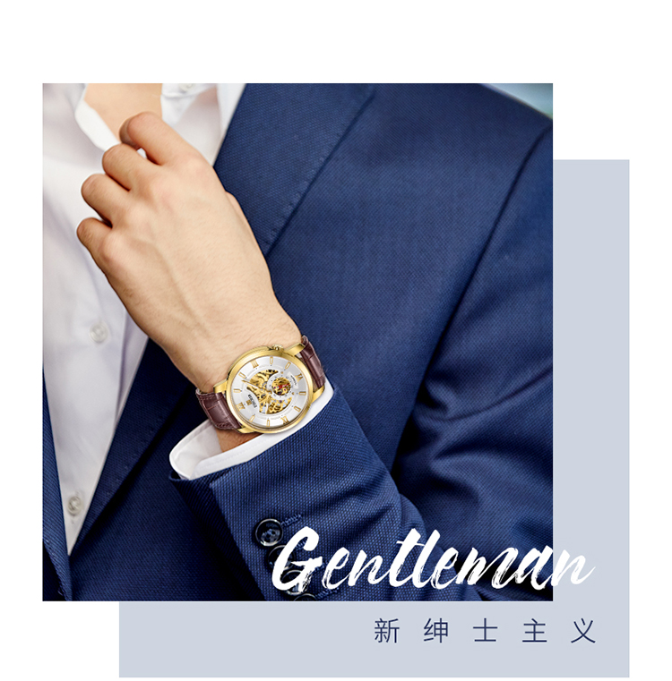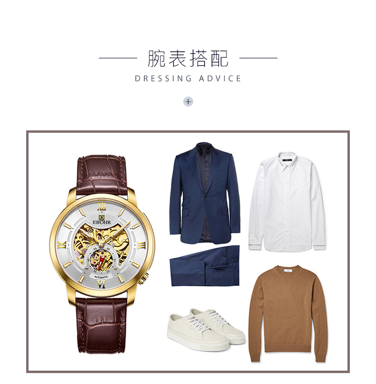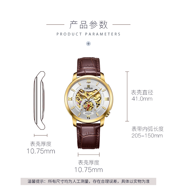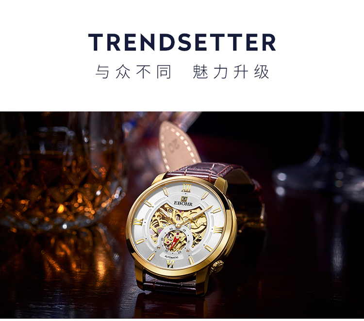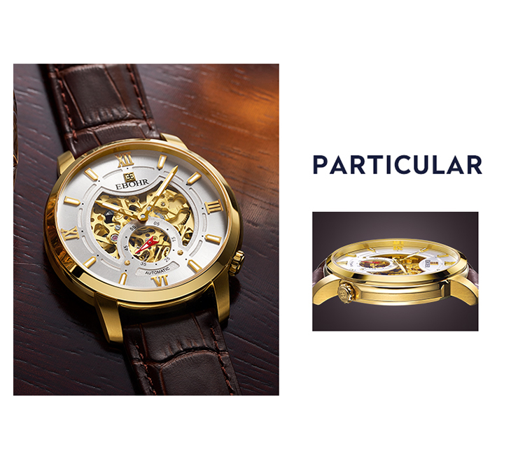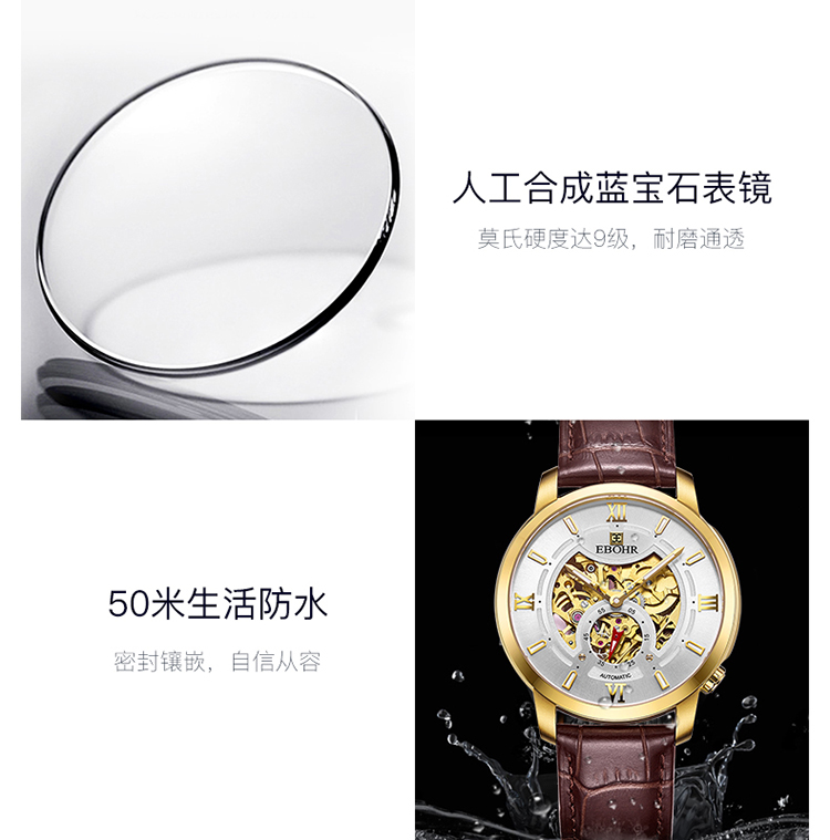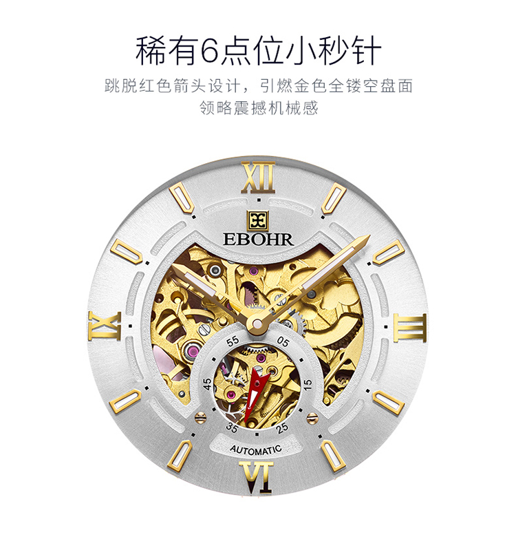 依波(EBOHR)经典时尚全镂空小秒盘自动机械皮带防水商务男表 36380138 金壳白面棕色皮带