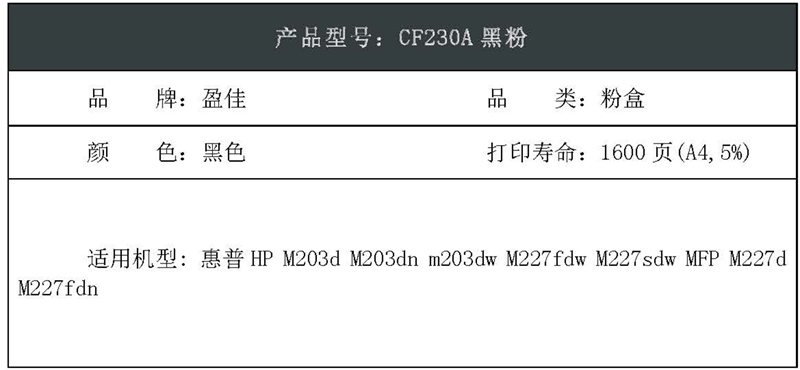 盈佳(Ink Cartridge) YJ-CF230A-F 商专版 1600页 适用HP M203d M203dn等 粉盒 (计价单位:只) 黑色