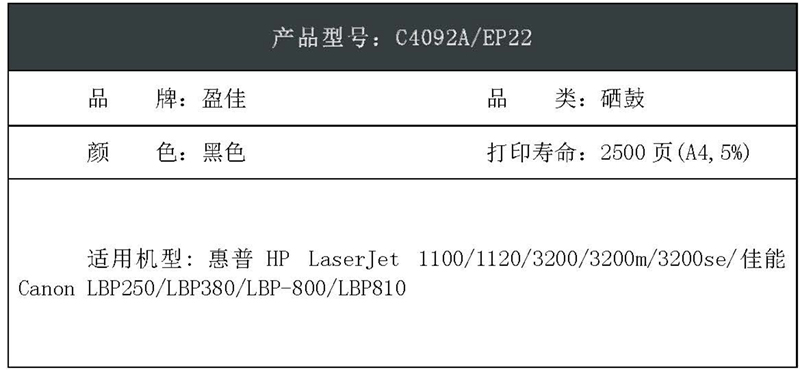 盈佳(Ink Cartridge) YJ-C4092A/EP22 2500页 适用惠普1100 1120 3200 硒鼓 (计价单位:只) 黑色