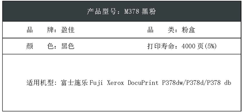 盈佳(Ink Cartridge) YJ-M378-F 4000页(5*) 适用富士施乐P378dw P378d 粉盒 1.00 只/个 (计价单位:个) 黑色