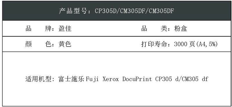 盈佳(Ink Cartridge) FX-CP305D 打印量3000页 适用施乐Docuprint CP305D 墨粉盒 (计价单位:只) 黄色