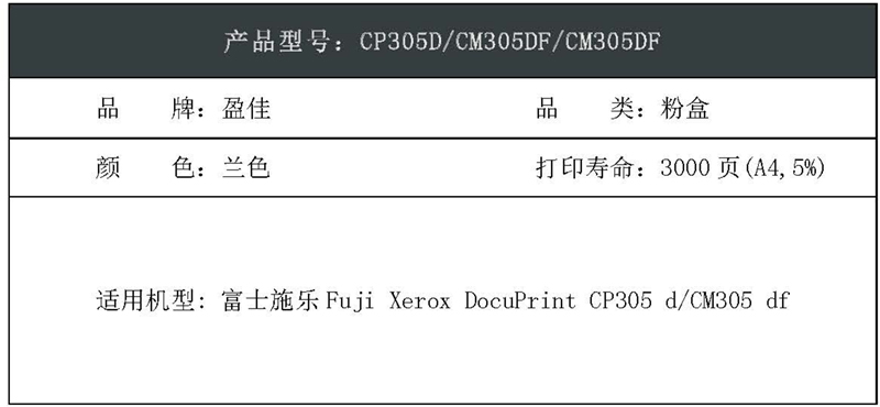 盈佳(Ink Cartridge) FX-CP305D 蓝色 3000页 适用施乐Docuprint CP305D 墨粉盒 (计价单位:只) 蓝色