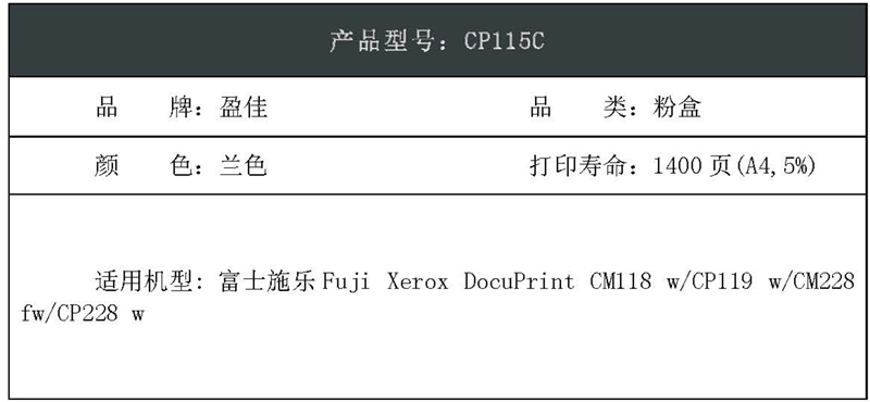 盈佳(Ink Cartridge) YJ-CM118-C 商专版 1400页 适用富士施乐CP118w等 粉盒 (计价单位:只) 蓝色