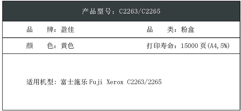 盈佳(Ink Cartridge) YJ-FX2263Y-F 企业版 打印量15000页 适用机型:富士施乐FujiXeroxC2263/2265 粉盒 (计价单位:只) 黄色