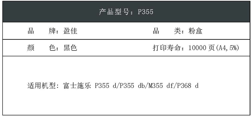 盈佳(Ink Cartridge) P355 商专版 打印量10000页 适用机型富士施乐 P355 d/P355 db/M355 df/P368 d 碳粉盒 1.00 只/个 (计价单位:个) 黑色