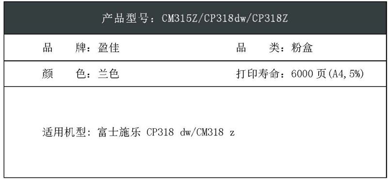 盈佳(Ink Cartridge) YJ-CP318-C-F 6000页 适用富士施乐CP318dw CM318z 粉盒 1.00 只/个 (计价单位:个) 兰色