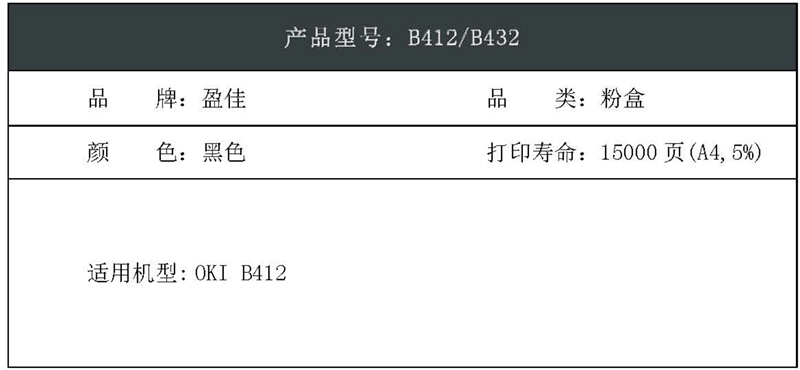 盈佳(Ink Cartridge) YJ-B412-F 15000页 适用OKI B412 粉盒 1.00 只/个 (计价单位:个) 黑色