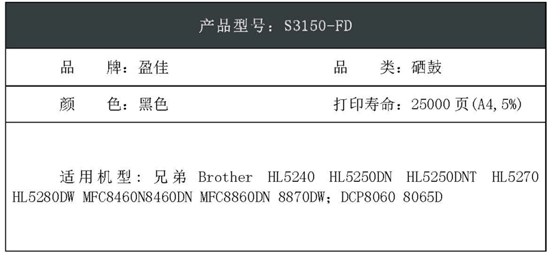 盈佳(Ink Cartridge) YJ-S3150/2435-FD 上尊系列 打印量12000页 适用机型:兄弟BrotherHL5240 硒鼓 (计价单位:只) 黑色