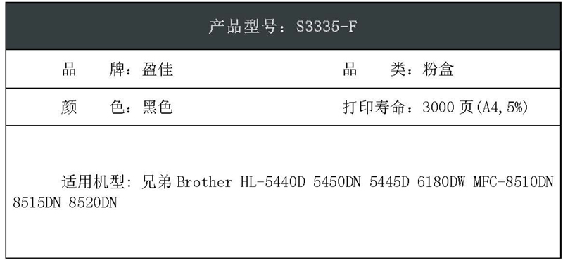 盈佳(Ink Cartridge) 上尊系列 TN3335 4637 打印量3000页适用兄弟 HL-5440D 墨粉盒 (计价单位:只) 黑色
