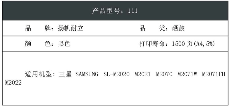 扬帆耐立(YFHC) 111 商专版 1000页 适用三星ML-2020W 硒鼓 1.00 只/支 (计价单位:支) 黑色
