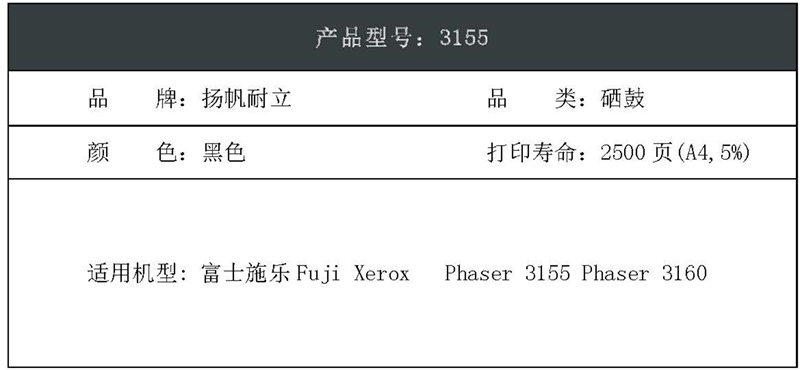 扬帆耐立(YFHC) 3155 商专版 打印量约2500页 适用于施乐 3155 3160 硒鼓 1.00 只/支 (计价单位:支) 黑色