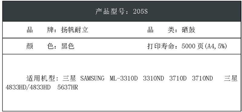 扬帆耐立(YFHC) 205S 商专版 打印量约5000页 适用三星3310ND 硒鼓 1.00 只/支 (计价单位:支) 黑色