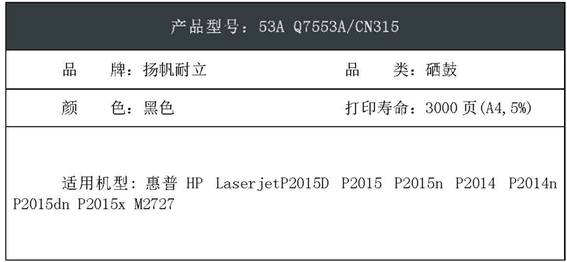扬帆耐立(YFHC) Q7553A/315 商专版 打印量约2500页 适用惠普P2015D 硒鼓 1.00 只/支 (计价单位:支) 黑色