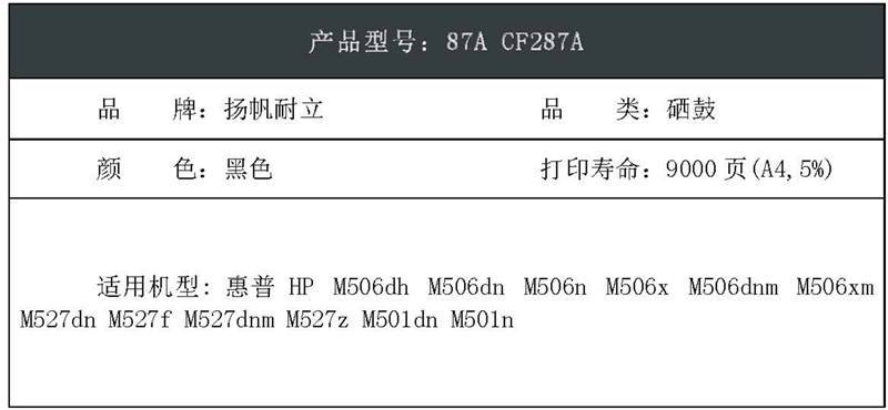 扬帆耐立(YFHC) CF287A(87A) 商专版 带芯片 适用惠普 M506dn 硒鼓 1.00 只/支 (计价单位:支) 黑色