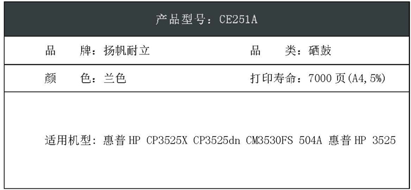 扬帆耐立(YFHC) CE251A 商专版 打印量约7000页 适用于惠普CP3525 CM3530 硒鼓 1.00 只/支 (计价单位:支) 蓝色