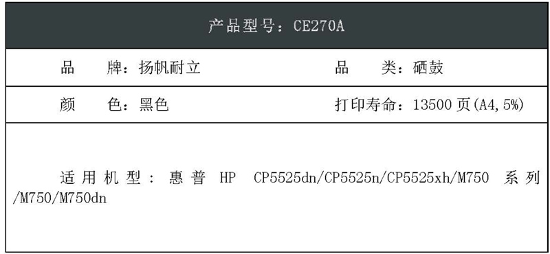 扬帆耐立(YFHC) CE270A 商专版 打印量约15000页 适用惠普CP5520 硒鼓 1.00 只/支 (计价单位:支) 黑色