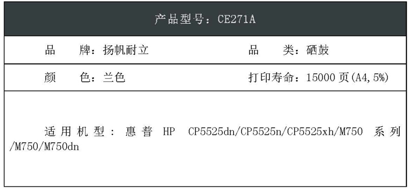 扬帆耐立(YFHC) CE271A 商专版 打印量约15000页 适用惠普CP5520 硒鼓 1.00 只/支 (计价单位:支) 兰色