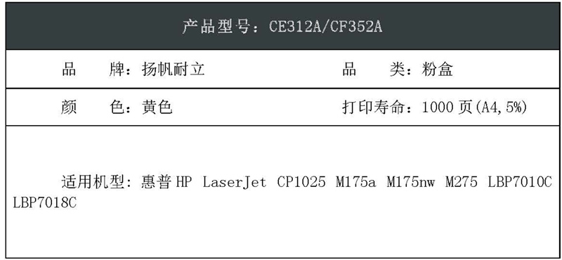 扬帆耐立(YFHC) CE312A 商专版 1000页 适用HP CP1025 M175 等 硒鼓 1.00 只/支 (计价单位:支) 黄色
