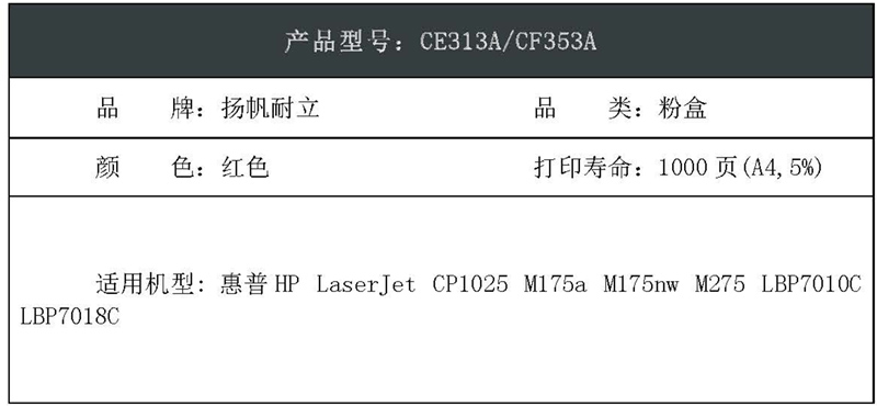 扬帆耐立(YFHC) CE313A 商专版 1000页 适用惠普CP1025 硒鼓 1.00 只/支 (计价单位:支) 红色