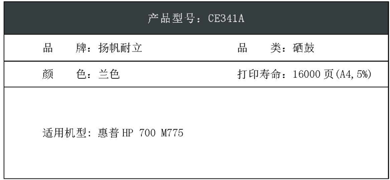 扬帆耐立(YFHC) CE341A 商专版 打印量约16000页 适用于惠普hp700 M775 硒鼓 1.00 只/支 (计价单位:支) 兰色