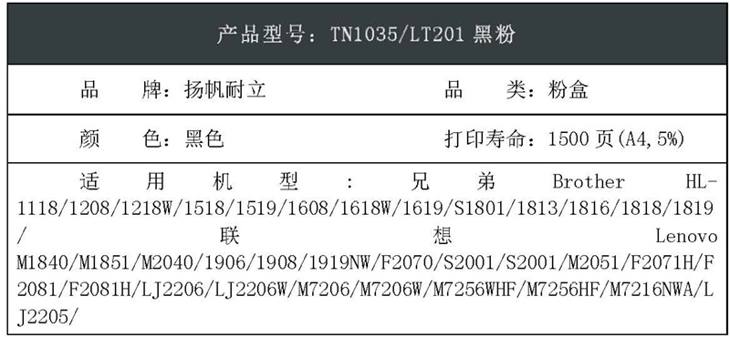 扬帆耐立(YFHC) TN1035 1500页 适用兄弟1118 1518 1813 1818 墨粉盒 1.00 只/支 (计价单位:支) 黑色