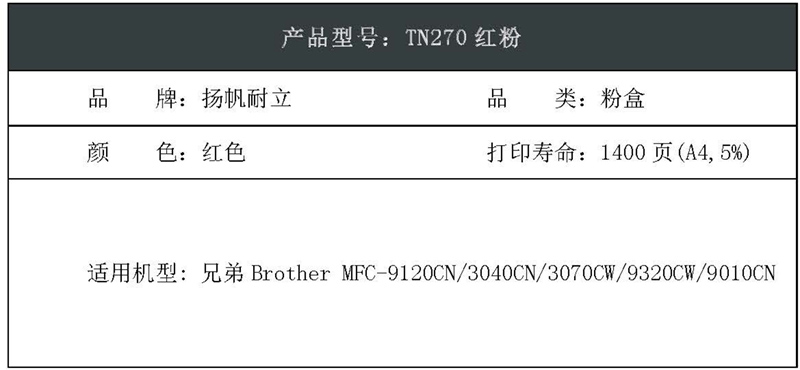 扬帆耐立(YFHC) TN270红粉 商专版 打印量1400页 适用兄弟DCP-9010 3040 3070 9120 9320 粉盒 (计价单位:只) 红色