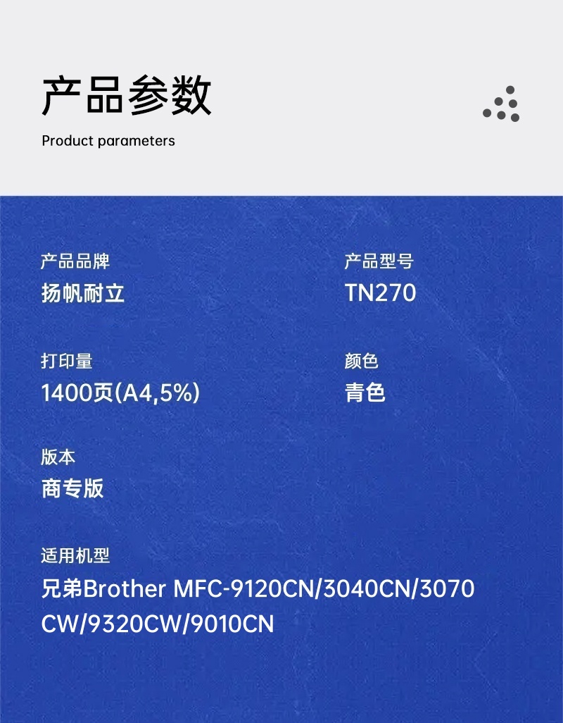 扬帆耐立(YFHC) TN270 蓝粉 商专版 打印量1400页 适用兄弟DCP-9010 3040 3070 9120 9320 粉盒 (计价单位:只) 兰色