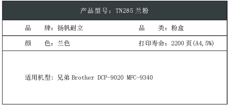 扬帆耐立(YFHC) TN285 商专版 打印量约2200页 适用兄弟DCP-9020 等 粉盒 1.00 只/支 (计价单位:支) 青色
