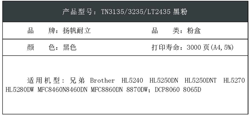 扬帆耐立(YFHC) TN3135/3235/2435 打印量3000页 商专版 打印量3000页 适用于兄弟HL5240等 硒鼓 1.00 只/支 (计价单位:支) 黑色