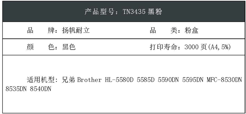 扬帆耐立(YFHC) TN3435 打印量3000页 商专版 适用兄弟HL05580D 5585D 5590DN 等 硒鼓 1.00 只/支 (计价单位:支) 黑色