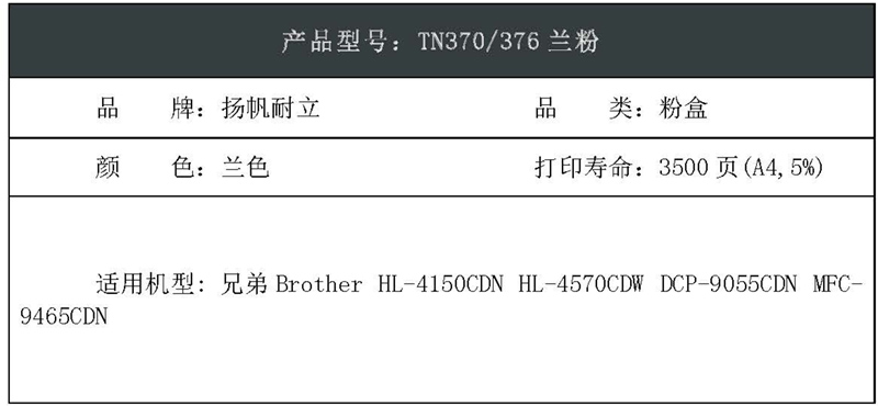 扬帆耐立(YFHC) TN370/376 商专版 适用兄弟HL-4150CDNHL-4570CDW等 粉盒 1.00 只/支 (计价单位:支) 兰色