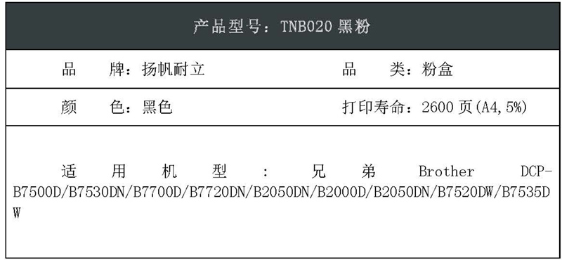 扬帆耐立(YFHC) YFHC-B020-F 2600页 适用兄弟DCP-B7500D 粉盒 1.00 只/个 (计价单位:个) 黑色