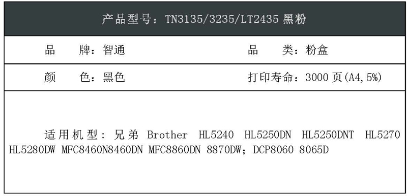 智通(ZT) TN3135/3235/LT2435 3000页 适用兄弟Brother HL5240 HL5250DN HL5250DNT HL5270 粉盒 1.00 只/支 (计价单位:支) 黑色