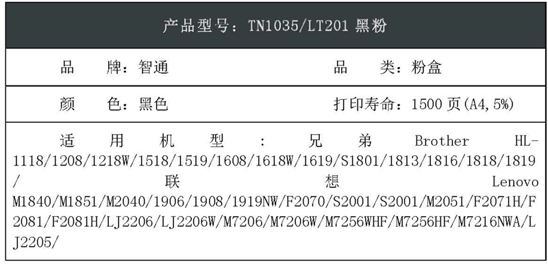 智通(ZT) ZT-1035/201-F 1500页 适用兄弟Brother HL-1118/1208/1218W联想Lenovo M1840 粉盒 1.00 只/支 (计价单位:支) 黑色