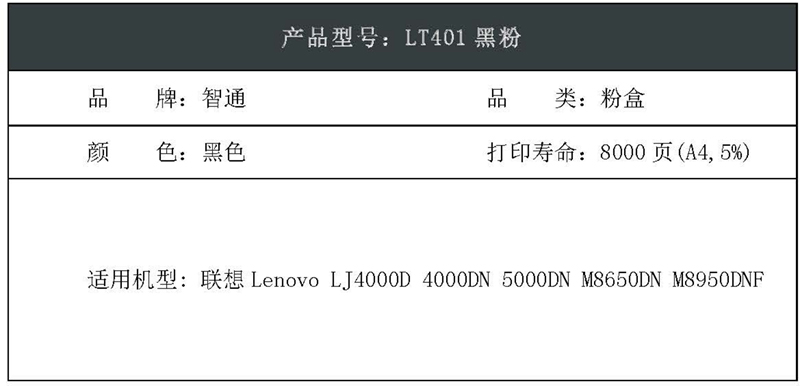 智通(ZT) ZT-LT401-F 8000页 适用联想Lenovo LJ4000D 4000DN 5000DN M8650DN M8950DNF 粉盒 1.00 只/支 (计价单位:支) 黑色
