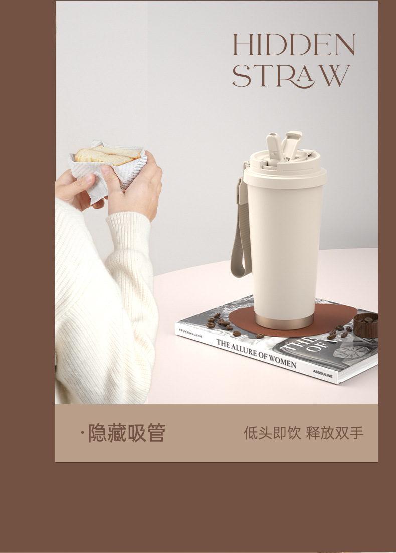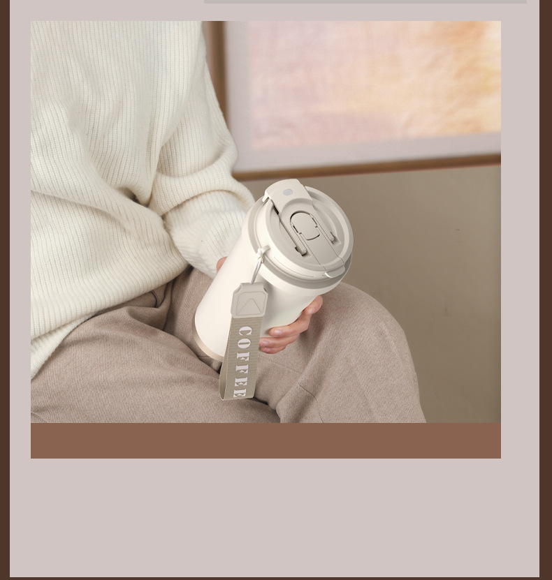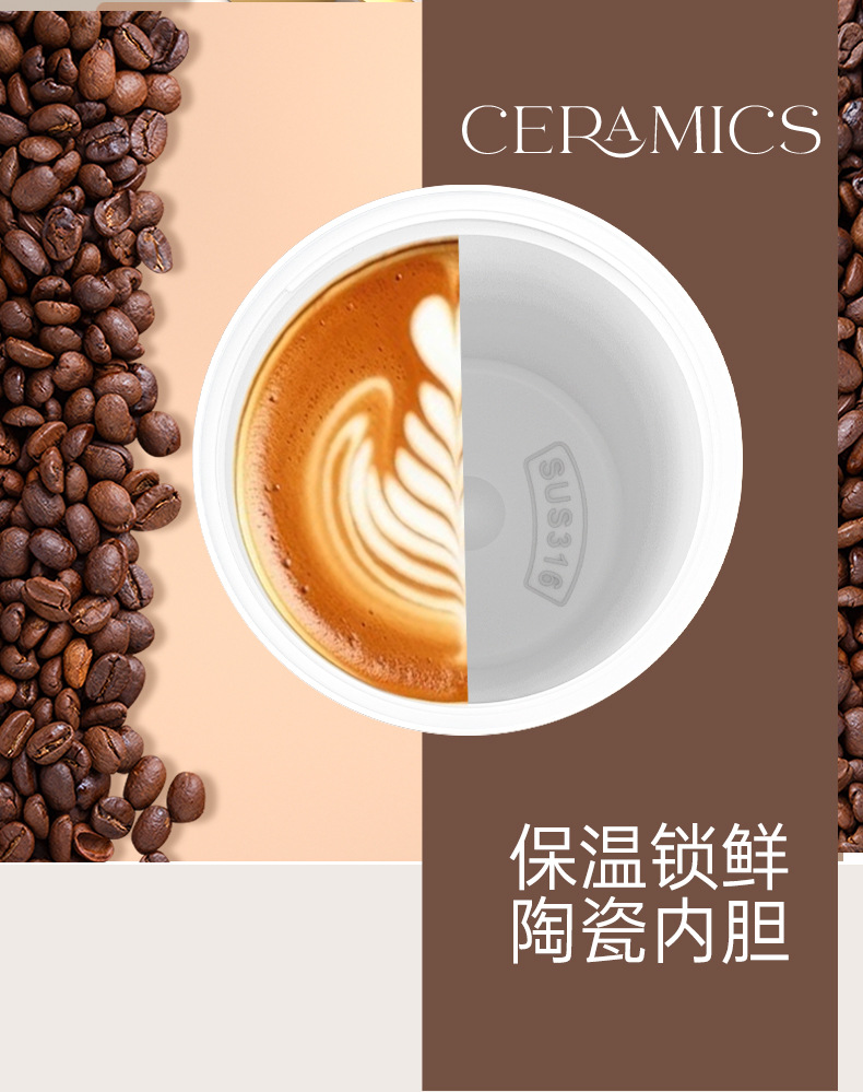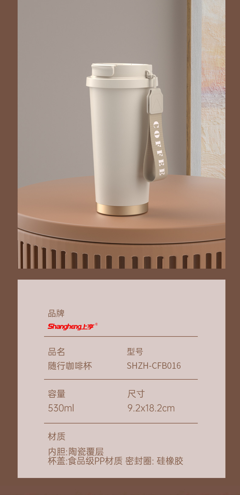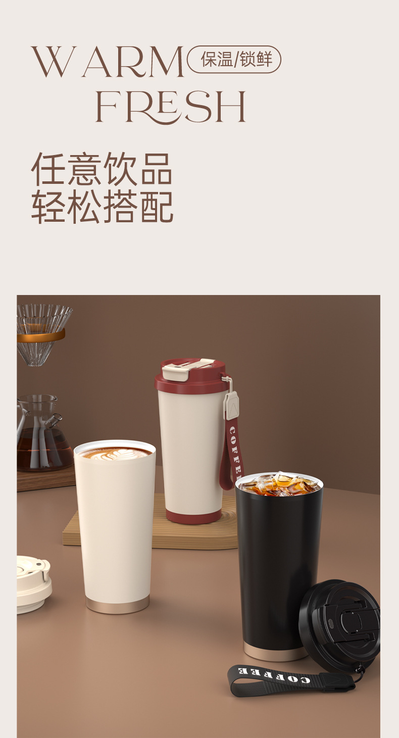 上亨时尚简约咖啡杯316不锈钢双层内胆陶瓷涂层尼龙挂绳便携 SHZH-CFB016 530ml/个 白色