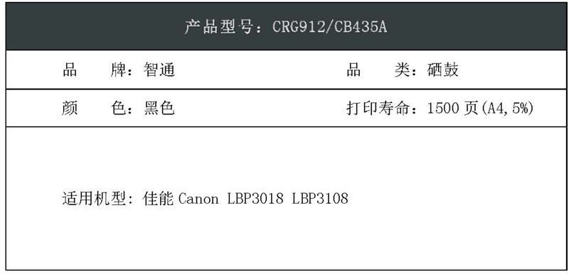 智通(ZT) CRG912/CB435A 带芯片 1600页 适用佳能Canon LBP3018 LBP3108 硒鼓 1.00 只/支 (计价单位:支) 黑色