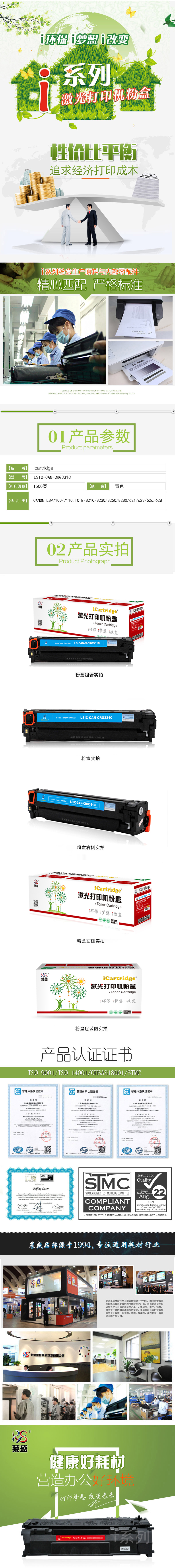 莱盛I系列 LSIC-CAN-CRG331C 粉盒 全新 有芯片 1.5K 青色