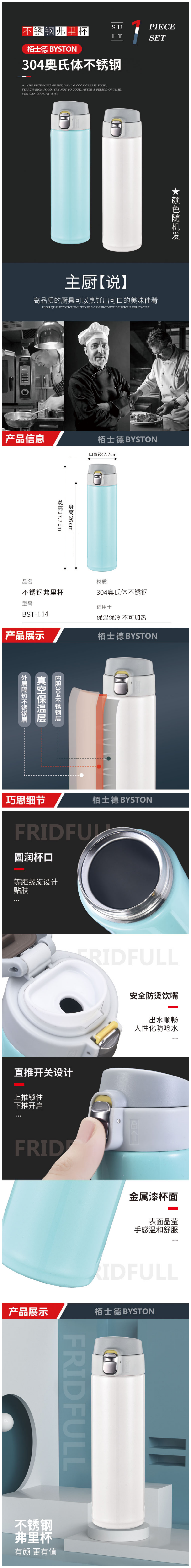 产品采用食品级304不锈钢,真空保温层,外层隔热不锈钢层,温度持久更安全;圆润杯口,等距螺旋设计;安全防烫饮嘴,出水顺畅,人性化防呛水;直推开关设计,上推锁住,下推开启;金属漆杯面,手感十分温和舒服,不易脱落。有颜更有值。