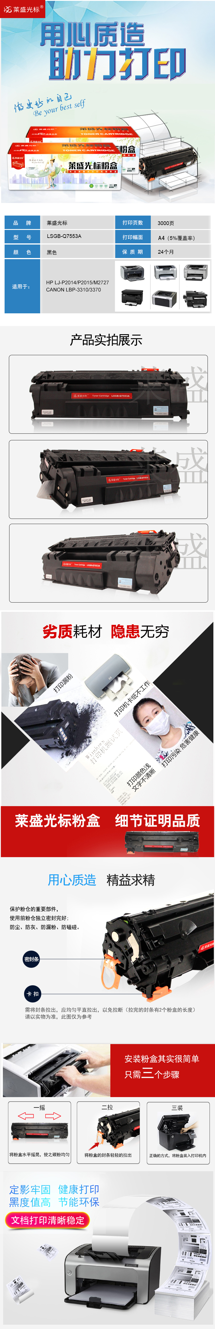 莱盛光标 LSGB-Q7553A 激光打印机粉盒 全新 有芯片 3K 12支/箱 黑色