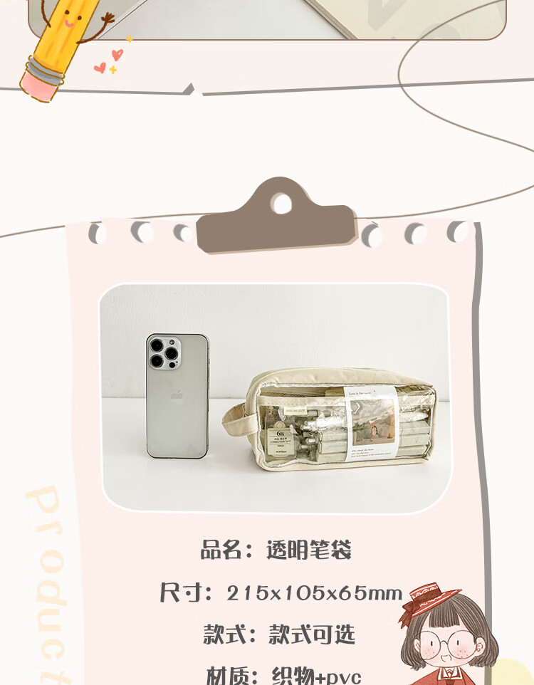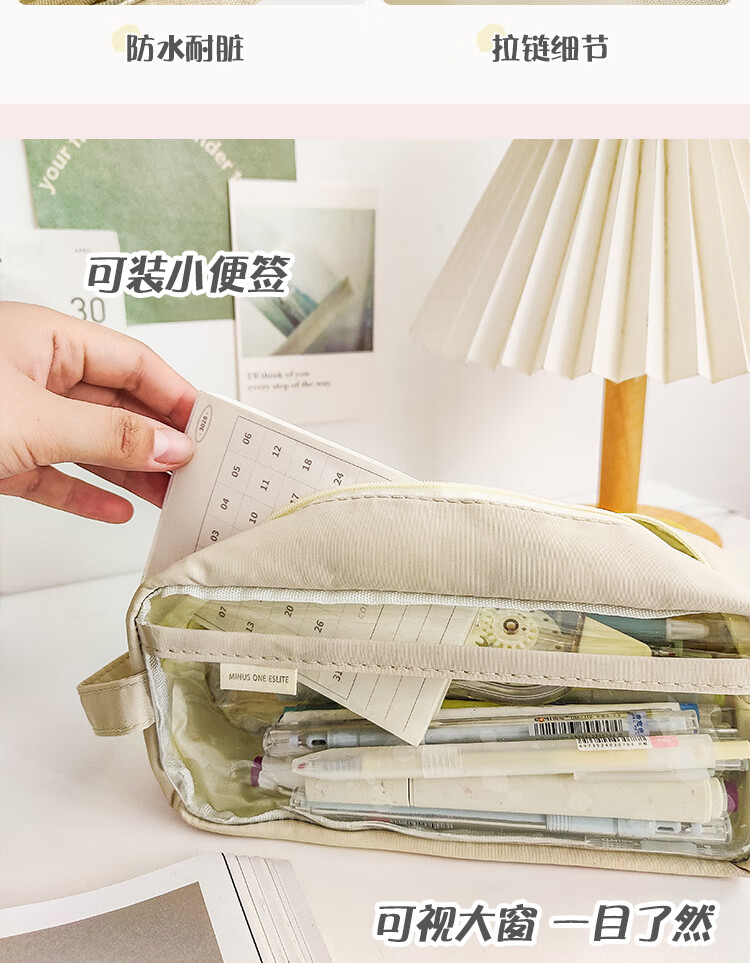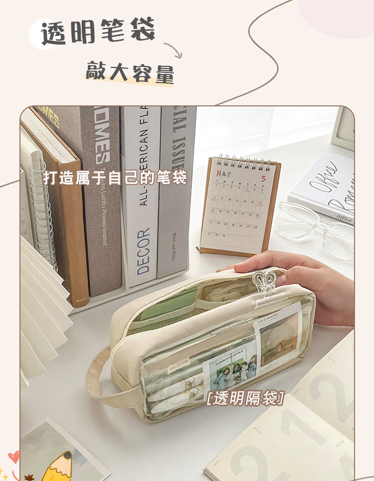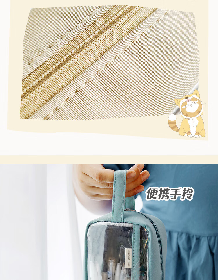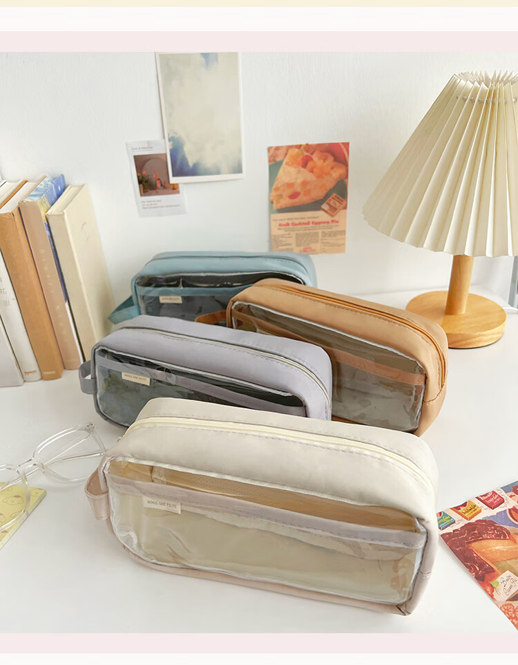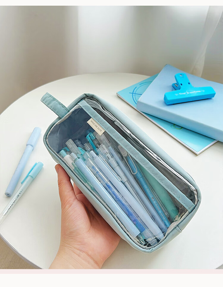 三年二班 透明简约手提小学生笔袋 日系ins风女生初中高中生文具盒 多层大容量铅笔盒 雾霾蓝