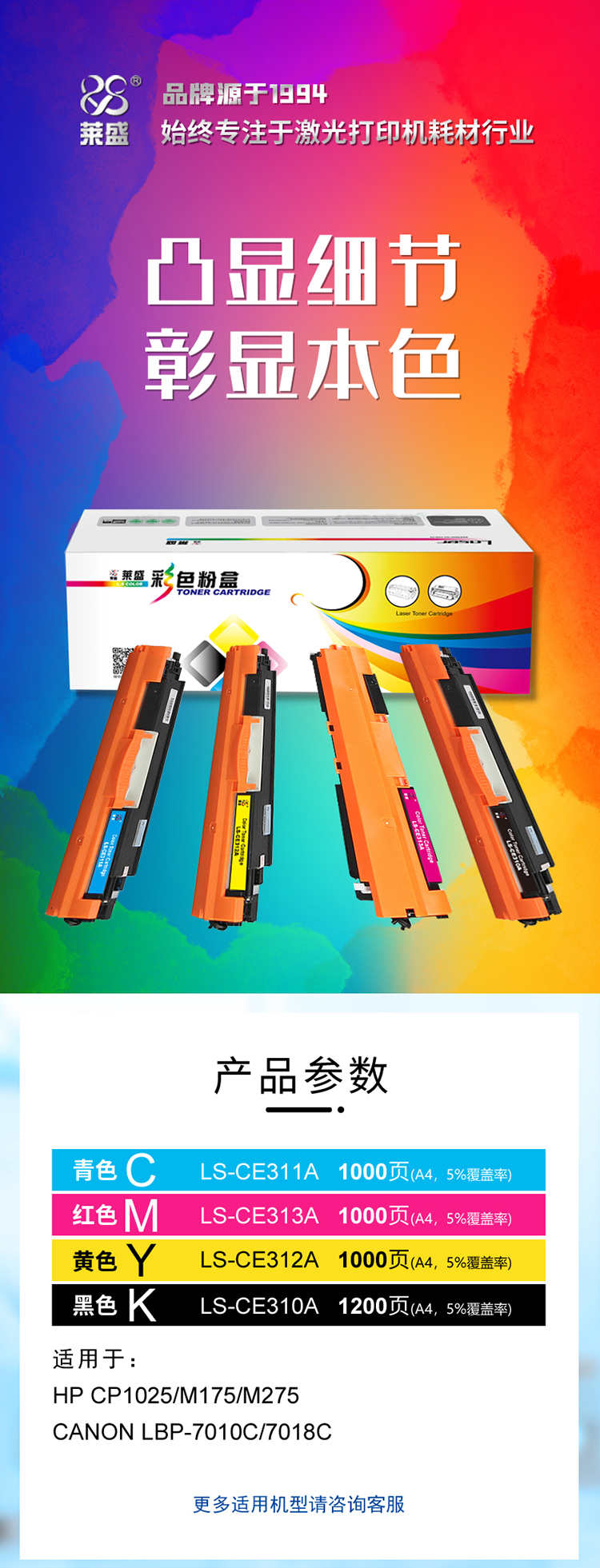 莱盛(laser) LS-CE312A 1000页 硒鼓粉盒 黄色 适用于 HP CP1025/M175/M275,CANON LBP-7010C/7018C 硒鼓 (计价单位:只) 黄色 黄色