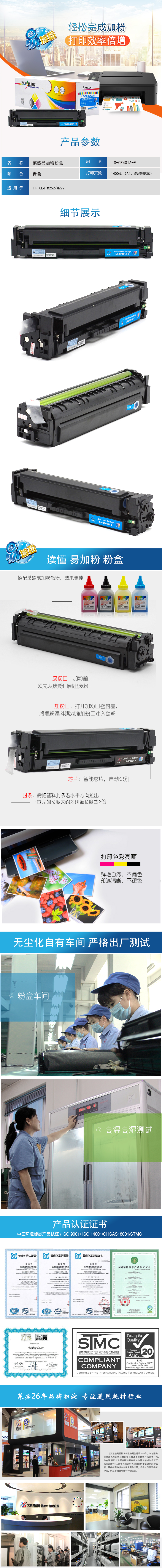 莱盛 LS-CF401A-E 彩色激光打印机粉盒易加粉 全新 有芯片 1.4K 20支/箱 蓝色
