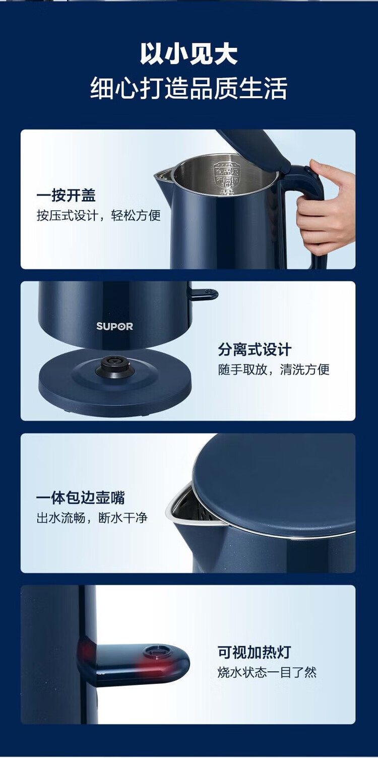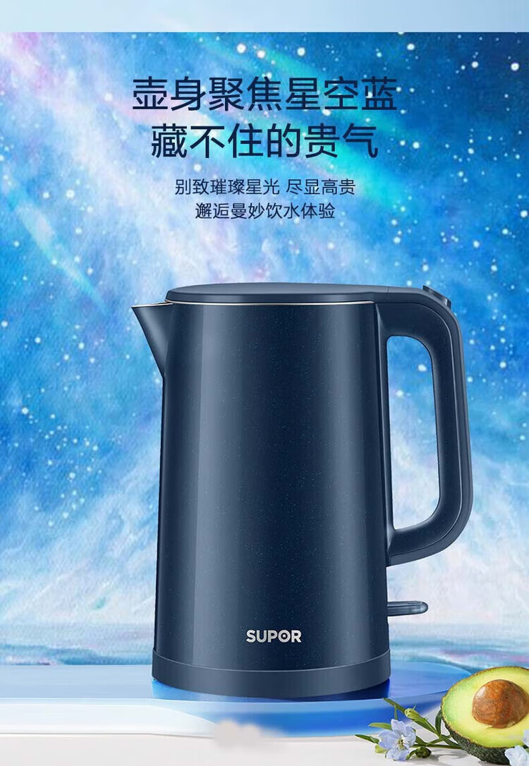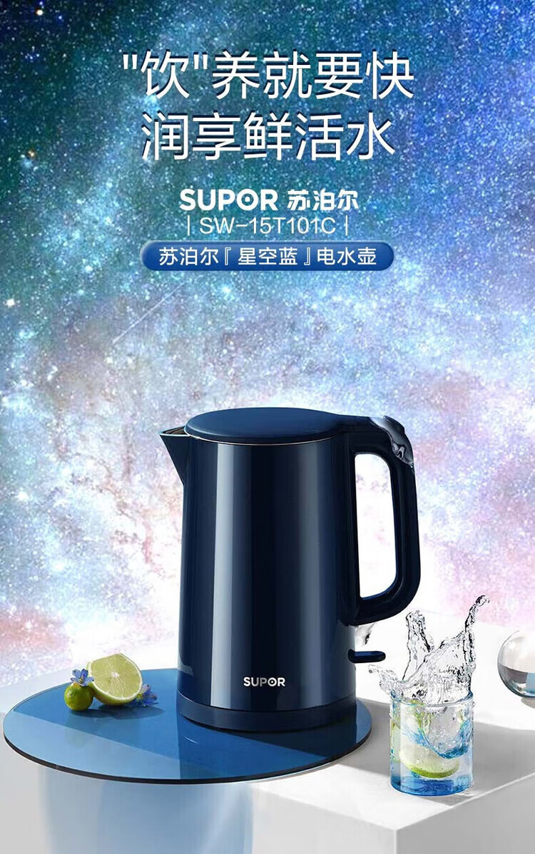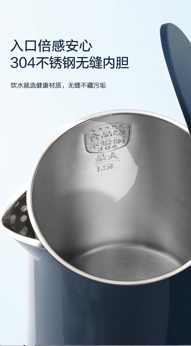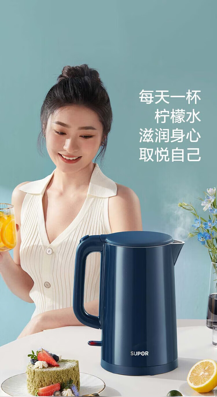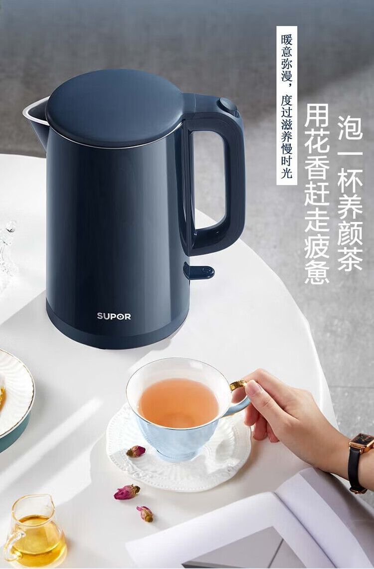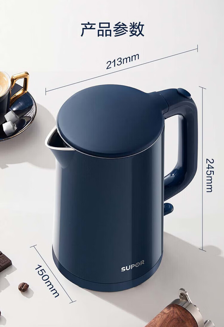 苏泊尔(SUPOR) SW-15T101C无缝内胆双层隔热304不锈钢1.5L电热水壶/个 深蓝色