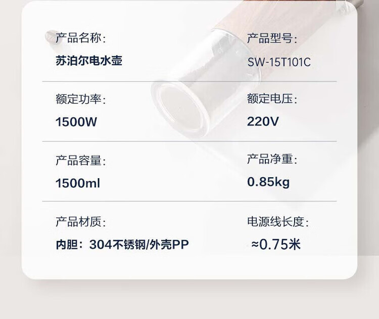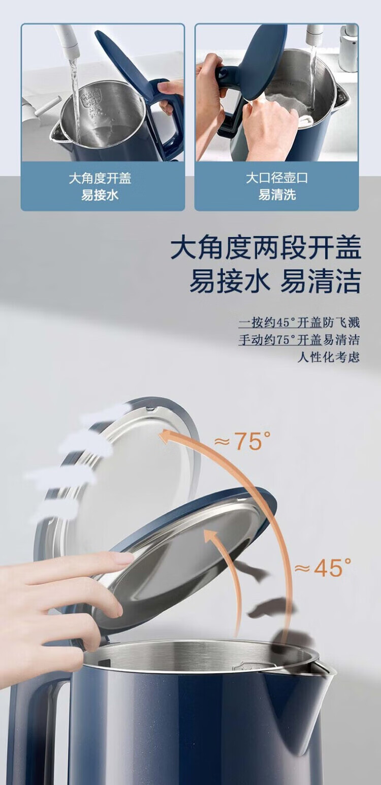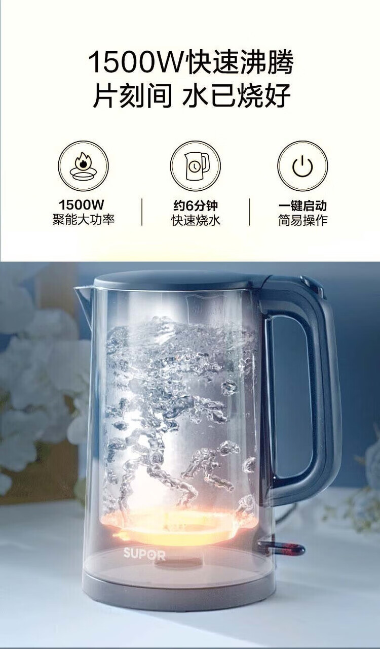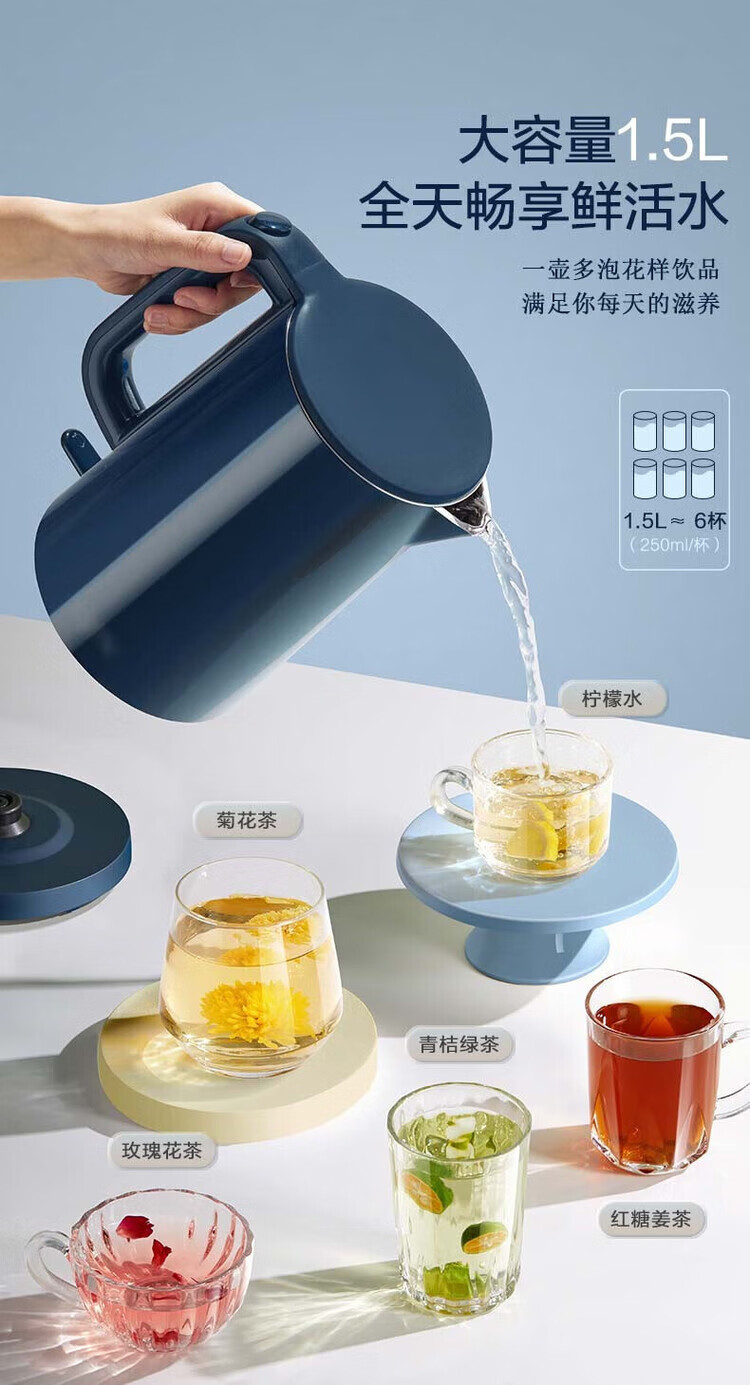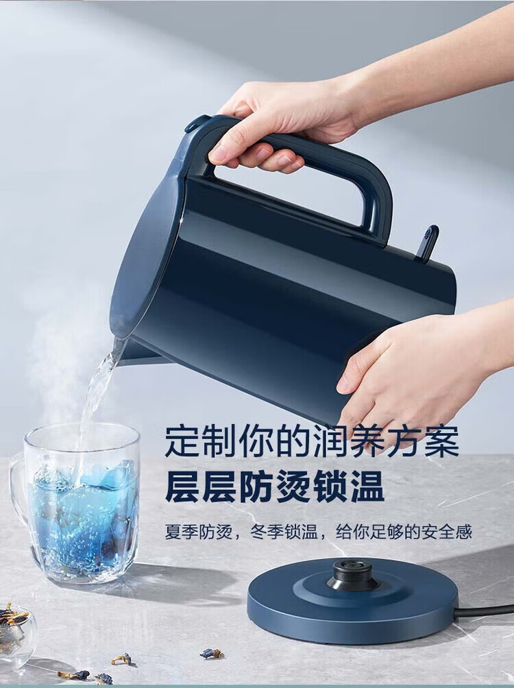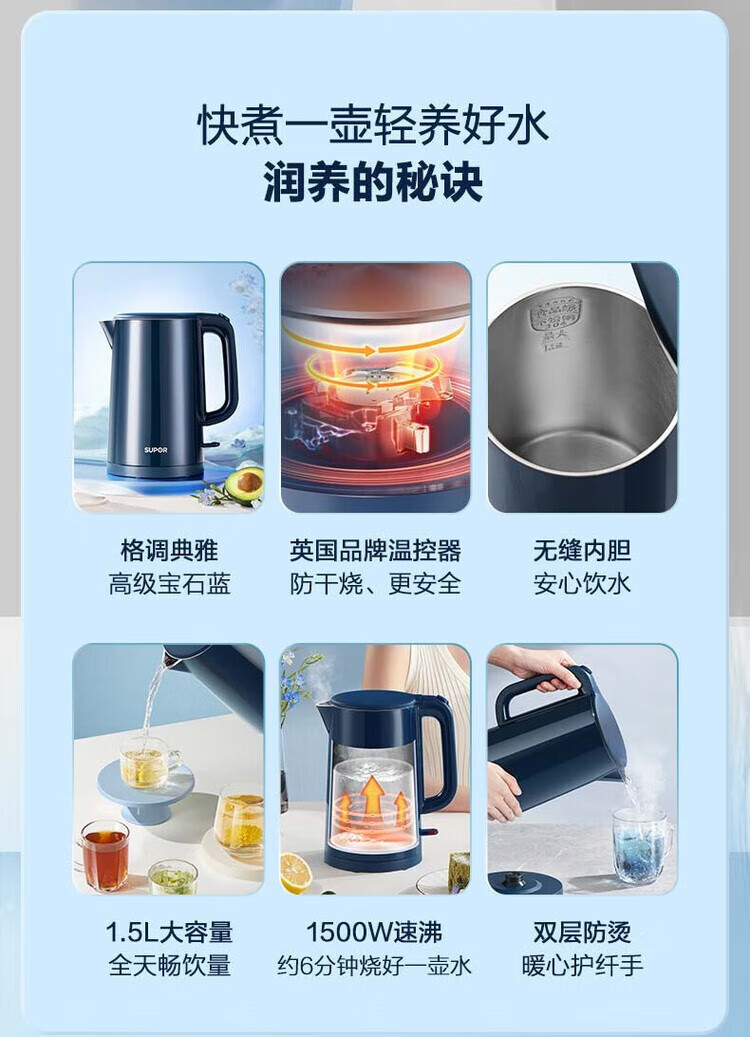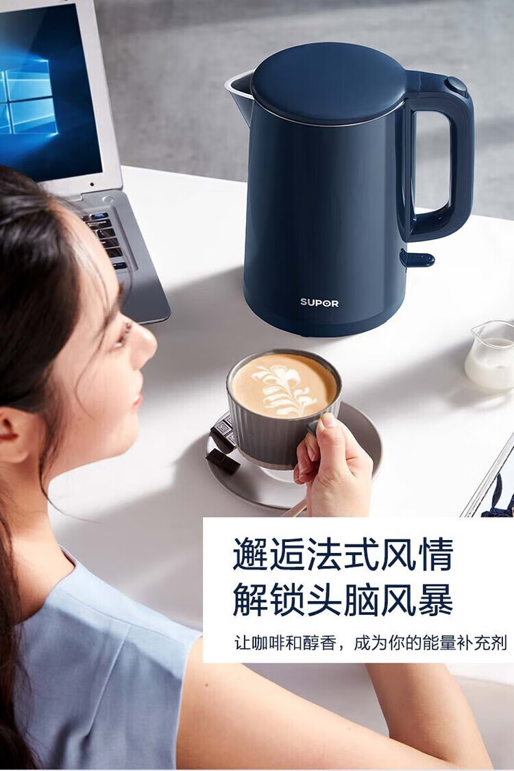 苏泊尔(SUPOR) SW-15T101C无缝内胆双层隔热304不锈钢1.5L电热水壶/个 深蓝色